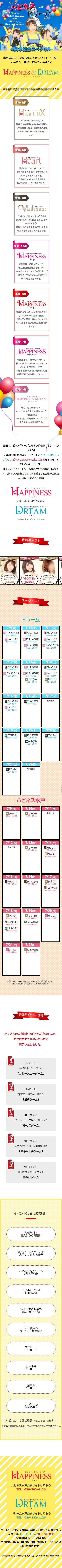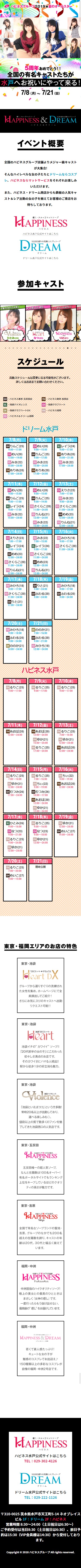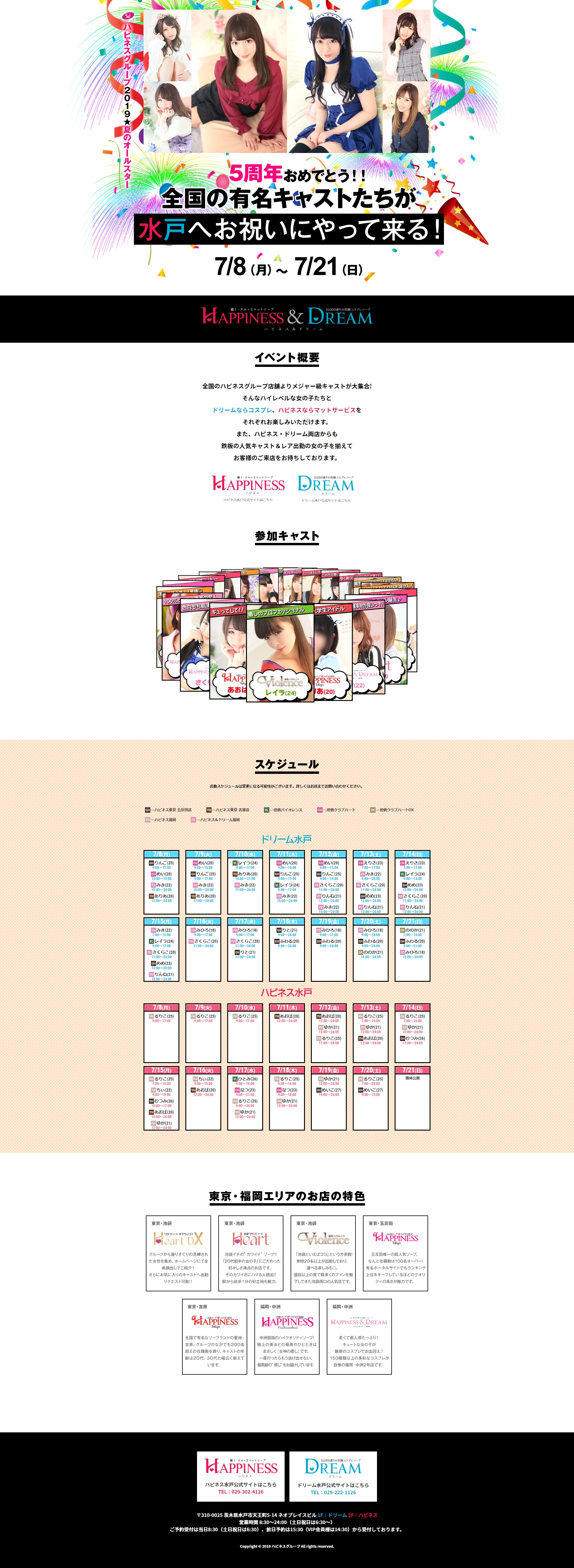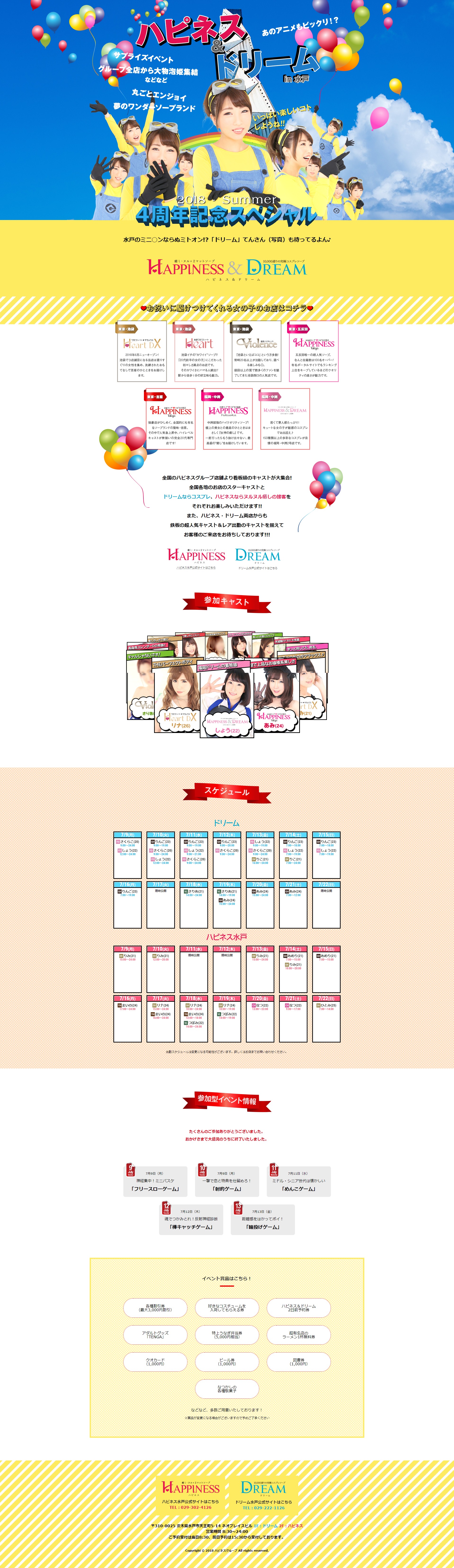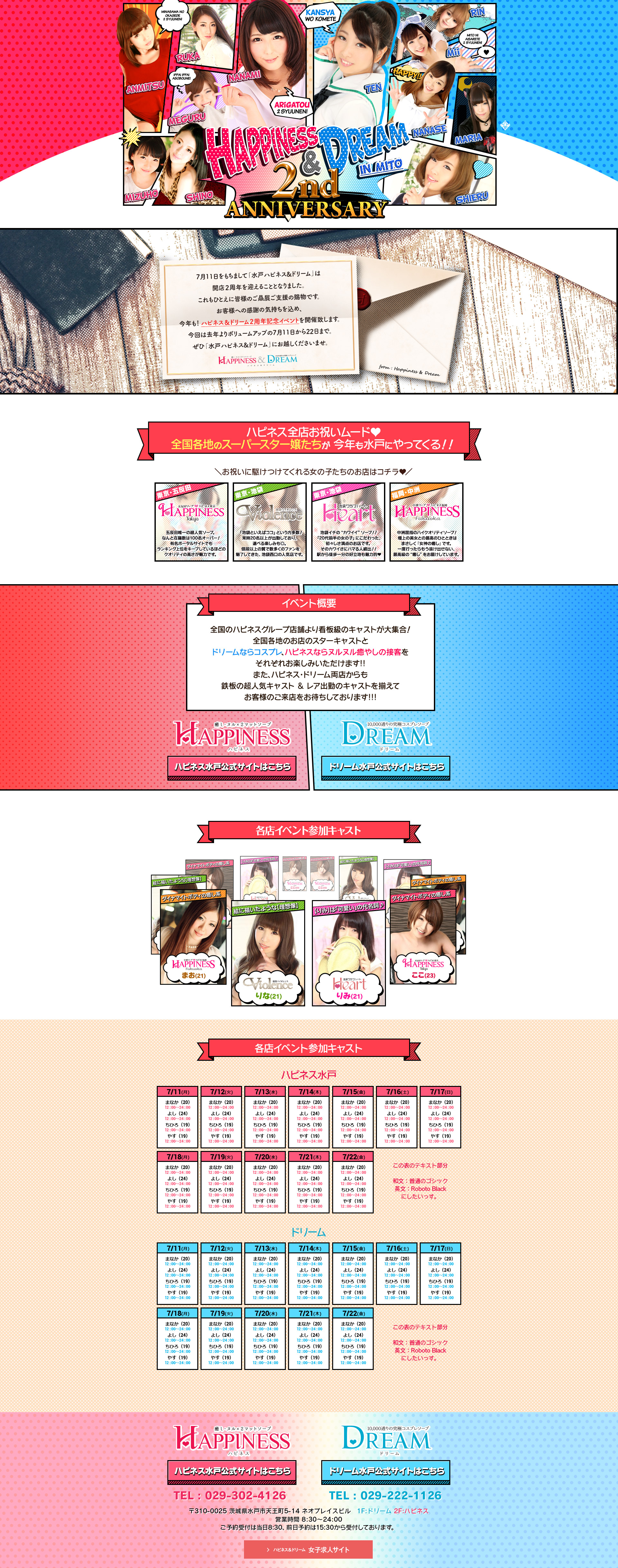 | 工夫した点・結果 | 初めて作成したLPでもある。以降の水戸エリア店舗イベントLPのひな型でもあるため、長く使うためにも諸々気を配った。 特にイベント参加キャストのホイール型スライドは何人参加するか、誰が参加するかが一目でわかるものなので、店舗スタッフもとても気にいてくれた模様。 ※スマホ版もあったはずですが、データの回収が叶いませんでした。 |
