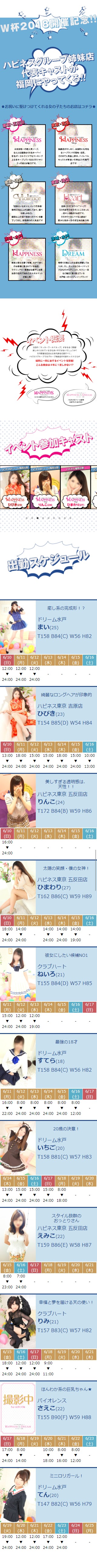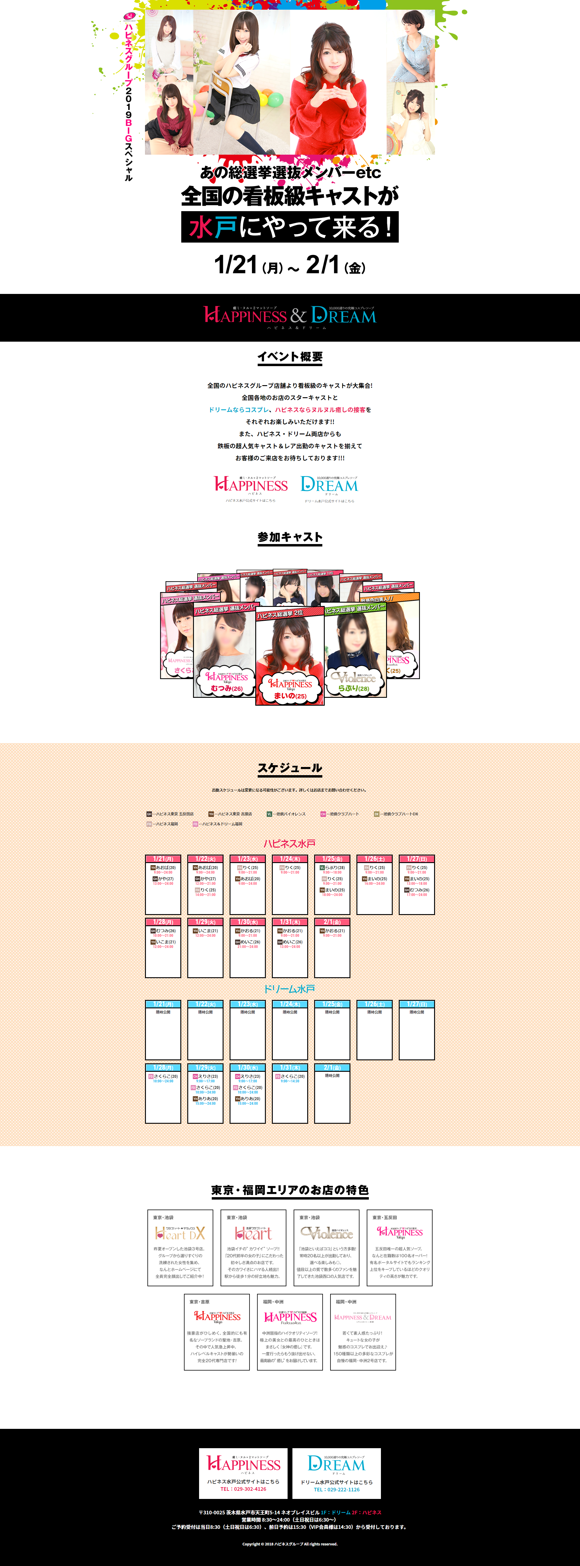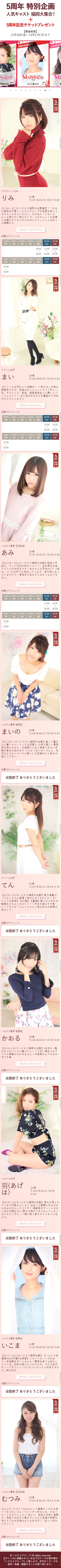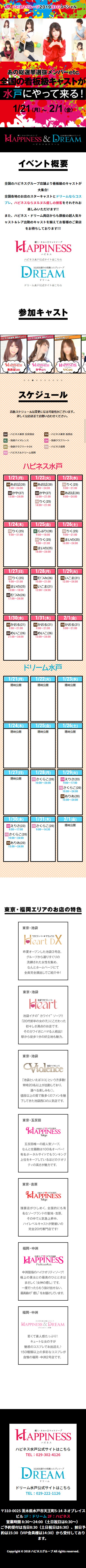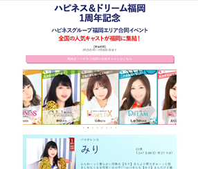 | 工夫した点・結果 | ハピネス福岡5周年LPとほぼ同じ。見分けやすいようにイベント参加キャスト情報の色を変更。 ちなみにサムネ画像(スライダーの)も水戸エリア店舗イベントLPのものを改変したもの。 |