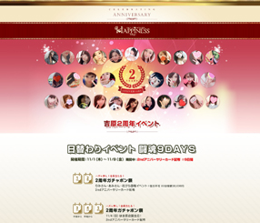 | 工夫した点・結果 | 初めて作成したLPでもある。以降の水戸エリア店舗イベントLPのひな型でもあるため、長く使うためにも諸々気を配った。 特にイベント参加キャストのホイール型スライドは何人参加するか、誰が参加するかが一目でわかるものなので、店舗スタッフもとても気にいてくれた模様。 ※スマホ版もあったはずですが、データの回収が叶いませんでした。 |