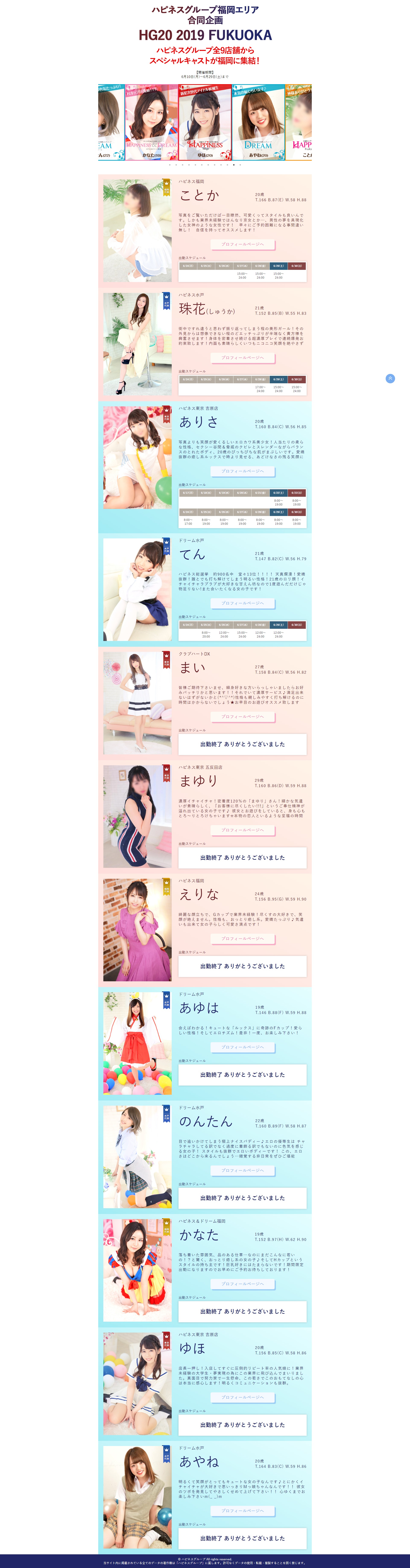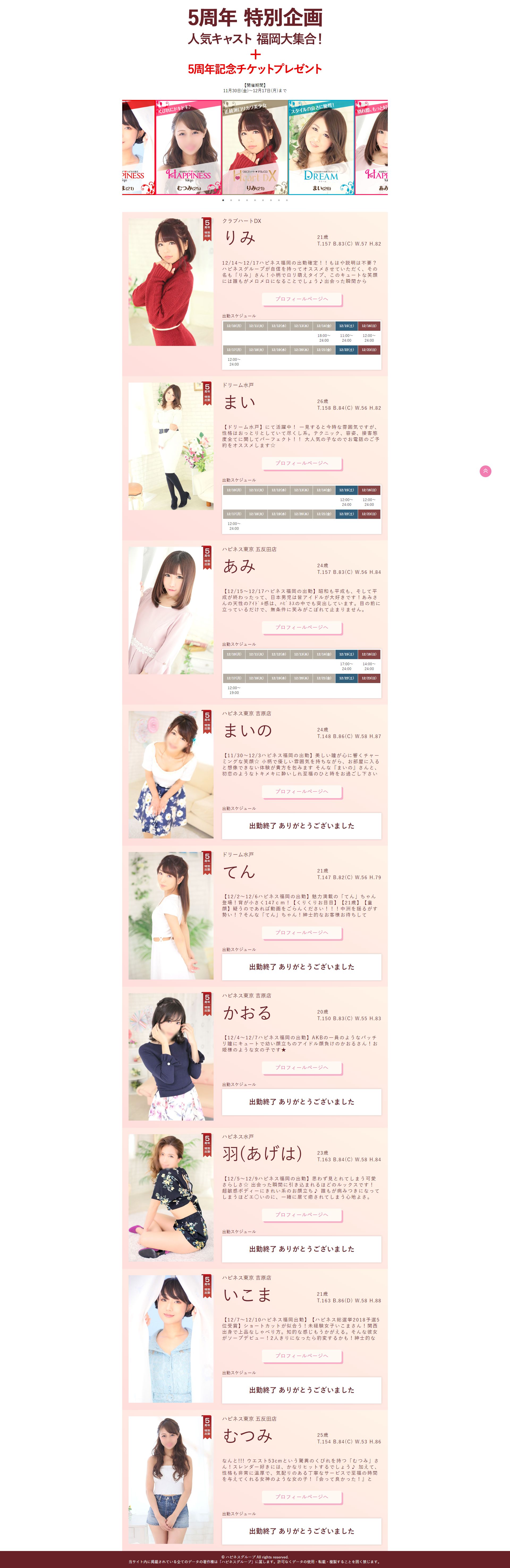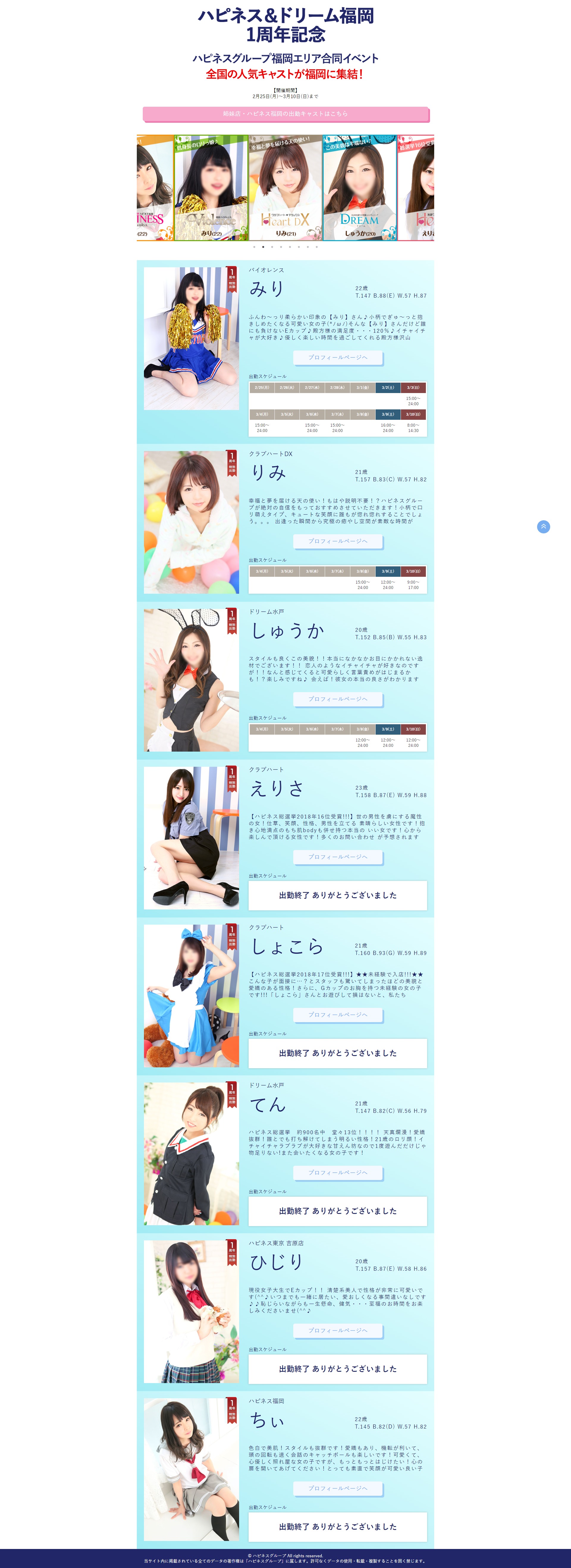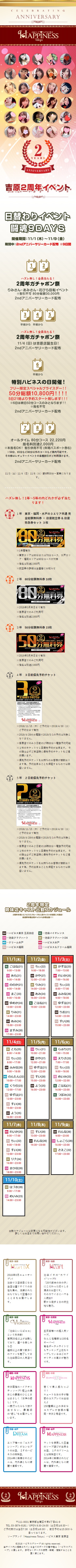 | 工夫した点・結果 | 過去データにあったハピネス福岡2周年LPを元に作成。これが福岡エリア店舗イベントLPのひな型となる。 イベント出勤終了したキャストのスケジュール表にその旨と感謝のメッセージを簡単に掲載。 |